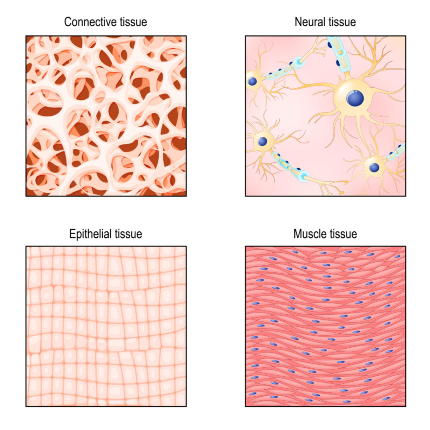 The human body contains four primary types of tissue: epithelial tissue, connective tissue, muscle tissue, and nervous tissue. Each of these tissues contributes to the structure and function of the body in distinctive ways.