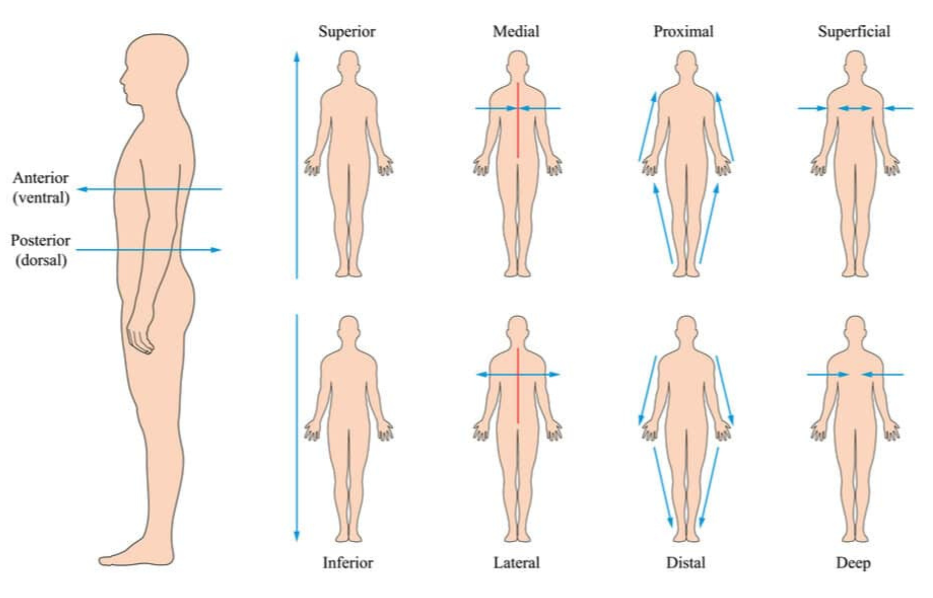 Anterior and posterior round out the core directional vocabulary. Anterior refers to the front of the body; posterior refers to the back. The sternum is anterior to the spine; the erector spinae muscles are posterior to the ribs.